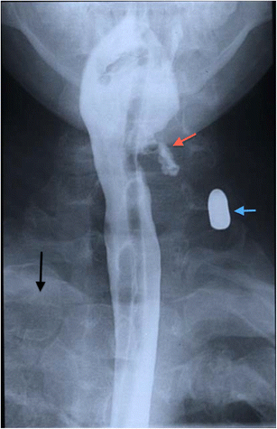 Contrast swallow assessment of a patient who sustained multiple penetrating gunshot injuries, including to the neck. A bullet is demonstrated in the soft tissues of the left zone 2 of the neck (blue arrow). A nasogastric tube was passed during the emergency trauma assessment and can be seen in situ. Haematoma is demonstrated in the left pyriform fossa with mucosal disruption and contrast leakage into the parapharyngeal tissues (red arrow). Note the opacification of the upper zone of the right hemithorax consistent with haemothorax (black arrow)