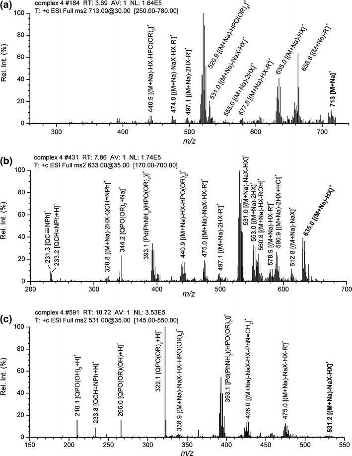 MS/MS spectra of (a) [M + Na]+ (m/z 713), (b) [(M + Na) – HX]+ (m/z 633), and (c) [(M + Na) – NaX – HX]+ (m/z 531) of complex 4 (L = L2, X = Br, R = n-Bu, R' = CH3CH2CH=CH2)