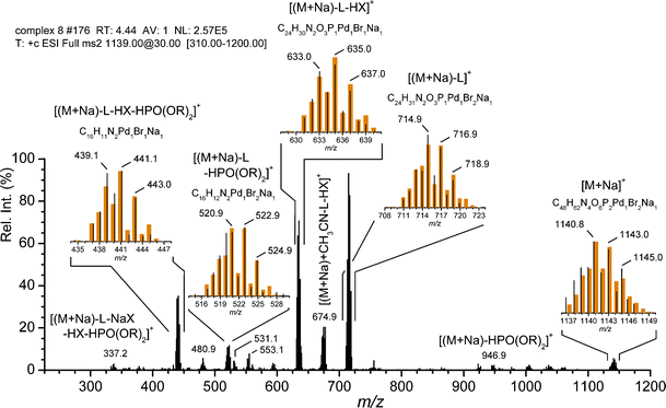 MS/MS spectrum of the molecular ion [M + Na]+ (m/z 1139) of complex 8 (L = L4, X = Br, R = n-Bu). Insets: experimental (lines) and theoretically calculated (bars) isotope patterns of assigned peaks