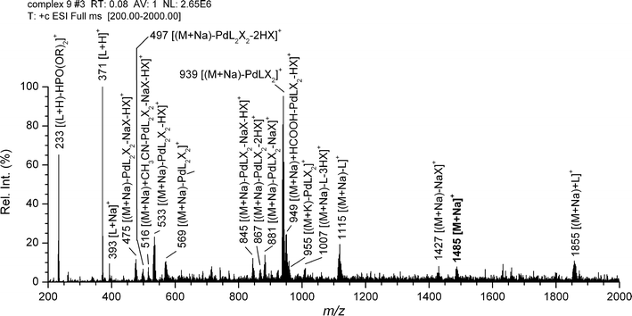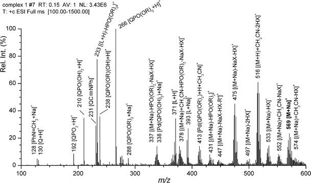 In the present work, the mass spectrometric behavior of the palladium(II) halide complexes of the reported α-anilinoquinolinylmethylphosphonates and α-quinolinylaminobenzylphosphonates was studied under electrospray ionization conditions (positive ions). This is a soft ionization technique, which has been widely used in the structural analysis of non-volatile and thermally labile species as large biomolecules and various coordination metal complexes [18, 19, 20, 21, 22]. ESI-MS enables detection and mass determination of large biomolecules such as proteins and provides investigation of the metallated biomolecules [18, 23, 24, 25]. Recent reports have shown that palladium(II) complexes spontaneously bind methionine, cytidine, and histidine residues and cause hydrolytic cleavage of short peptides [26, 27, 28]. As the ESI-MS method allows pre-existing ions in solution to be very gently transferred to the gas phase with minimum fragmentation, it allows study of inorganic and organometallic chemistry in solution as a complementary technique to NMR spectroscopy and electrochemistry [29]. The ability of ESI-MS to detect and characterize species and reaction intermediates in solution, often at very low concentrations, provides a convenient means of following the pathways of many reactions as well as the reactivity of the complexes in solutions in terms of their stability, ligand exchange, and selectivity.