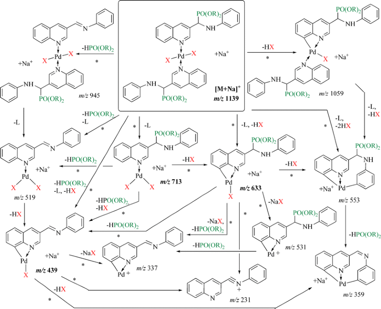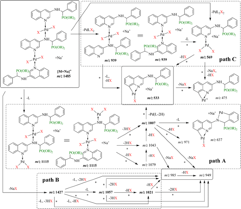 We observed a number of species in the ESI mass spectra of the investigated palladium quinolinylaminophosphonate complexes, which could be ascribed to several factors such as the halide and/or organophosphorus ligand exchange, the ligand–solvent exchange, as well as the ion–molecule and the ion–ion interactions. Detailed fragmentation pathways of complexes were analyzed by tandem mass spectrometry.