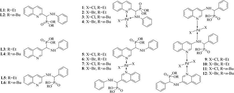 Palladium(II) dihalide complexes cis-[Pd(L1/L2)X2] (1–4), trans-[Pd(L3/L4)2X2] (5–8), and dipalladium tetrahalide complexes [Pd2(L5/L6)3X4] (9–12) (X = Cl, Br) were prepared by reaction of diethyl and dibutyl [α-anilino-(quinolin-2-yl)methyl]phosphonate (L1, L2), [α-anilino-(quinolin-3-yl)methyl]phosphonate (L3, L4), and [α-(quinolin-3-ylamino)-N-benzyl]phosphonate (L5, L6), respectively, and Na2[PdX4] (X = Cl, Br) in methanol according to the previously published methods [17].