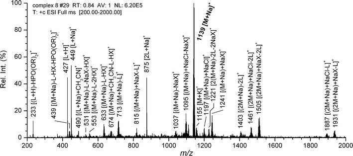 ESI mass spectrum of complex 9 (L = L6, X = Cl, R = n-Bu) in CH3CN/0.1% HCOOH