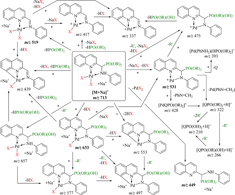 The main fragmentation reactions confirmed by tandem mass spectra are outlined in Scheme 1 for complex 4, as an example of the common pattern for these complexes. Generally, the complex decomposition goes under two fragmentation routes: the first, in which the sodium molecular adduct sequentially loses hydrogen halides (or sodium halides) and the second, in which this loss is in competition with the loss of the part or the whole phosphonate moiety (Figure 2 and Figure S1). These two routes give various types of mono- and dihalidopalladium N,N-chelate ions as well as palladium and monohalidopalladium tridentate N,N,C-chelate fragment ions, most likely formed by cyclopalladation through the C-8 carbon atom of the quinoline ring along with coordination through both, the quinoline and aniline nitrogen atoms.