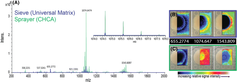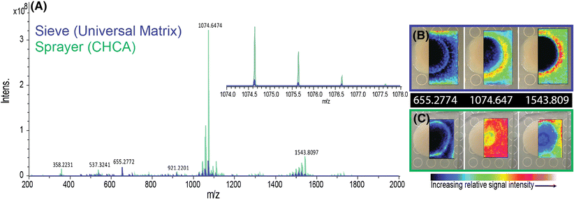 Spectral and ion image comparison of MALDI MSI analysis of B. subtilis cultures using the sieve method (blue) and the sprayer method (green). (A) Average mass spectrum of the entire image for both methods. (B) Ion images from sieve method, and (C) ion images from sprayer method, where m/z of 655.2774 is coproporphyrin I or III [M + H]+, 1074.647 is surfactin [M + K]+, and 1543.809 is plipastatin-C17-Val [M + K]+. Molecular identities based on gnps.ucsd.edu. All ion images are normalized to the total ion current. More ion images can be seen in Figure S3