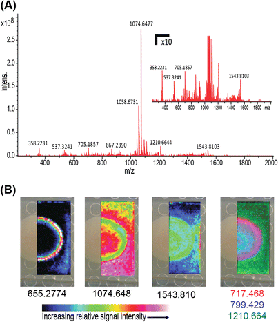 (A) Average spectrum and (B) ion images of MALDI MSI analysis of a B. subtilis culture where DHB was applied using the sprayer method. (B) Ion images of m/z of 655.2774 (coproporphyrin I or III; [M + H]+), 1074.648 (surfactin; [M + K]+), 1543.810 (plipastatin-C17-Val; [M + K]+), and an overlay of 717.468 (PG 30:0; [M + H]+), 799.429 (phakellistatin 13; [M + H]+), and 1210.664 (unknown) ion images. All ion images are normalized to the total ion current. Molecular identities based on gnps.ucsd.edu. Figure S4 contains addition ion images