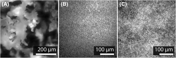 Optical microscope images of the agar sample surfaces after matrix has been applied, using (A) a 53 μm sieve or (B and C) the automated sprayer. The matrix at the surface of (A) and (B) is CHCA, whereas the matrix used in (C) is DHB. All samples are dry. Photographs of prepared samples can be seen in Figure S2