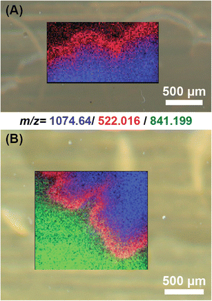 Ion images around the boarder of the B. subtilis using the sprayer method and applying either (A) CHCA or (B) DHB. A 30 μm and a 20 μm step size was used in (A) and (B), respectively. Overlay of m/z 1074.64 ± 0.01 (surfactin; [M + K]+; blue), 522.016 ± 0.003 (unknown; red), and 841.199 ± 0.004 (unknown; green); m/z 841.199 was only detected within the colony (Figure S5) using CHCA; very little MALDI signal was seen outside the colony in general with these imaging conditions. Additional high-lateral resolution images of the DHB sample can be seen in Figure S6