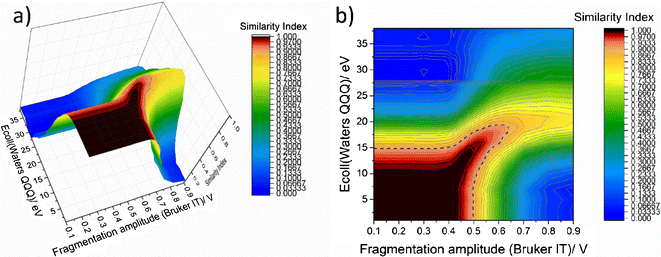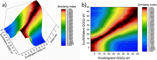 Similarity indices shown (a) as a 3D contour map, and (b) as a “heat map” for all combinations of collision energies determined on Waters QQQ and Bruker ion trap instruments