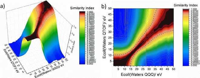 Similarity indices shown (a) as a 3D contour map, and (b) as a “heat map” for all combinations of collision energies determined on Waters QTOF and Waters QQQ instruments