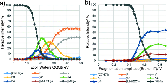 The collision energy was varied in the 1–110 eV range on the quadrupole type instruments. We have used between 1 and 10 eV, 2 eV steps, between 10 and 30 eV, 1 eV steps, between 30 and 50 eV, 2 eV steps, and after 50 eV until 110 eV, 10 eV steps. In case of Bruker ion trap we have used between 0.1 and 0.3 V, 0.1 V steps, between 0.3 and 0.4 V, 0.02 V steps, between 0.4 and 0.5 V, 0.01 V steps, between 0.5 and 0.7 V, 0.02 V steps, and after 0.7 V until 0.9 V, 0.1 V steps.