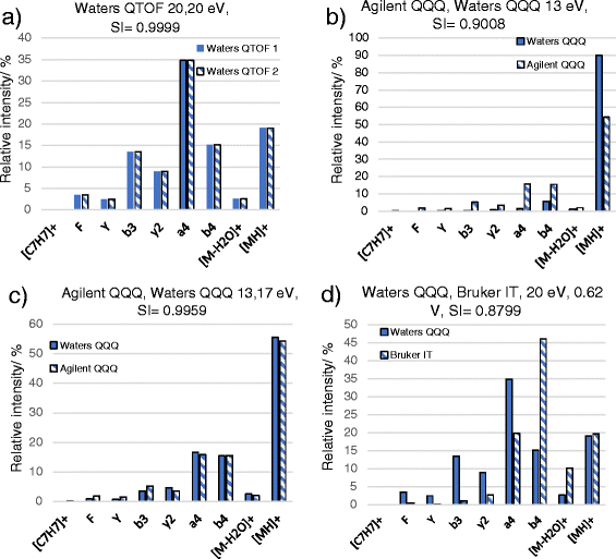 Similarity of tandem mass spectra of leucine enkephalin (YGGFL) measured (a) on the same QTOF type instrument, but in 1 year distance in time, (b) on two QQQ type instruments (Waters and Agilent), both obtained at 13 eV collision energy, (c) on two different QQQ instruments using collision energies that give the most similar spectra (collision energies are 13 and 17 eV, respectively), (d) on QQQ and ion trap instruments (the collision voltage on IT were tuned to give the best similarity index)