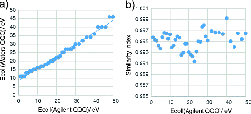 (a) Combination of collision energies that yield the most similar spectra on the two QQQ type instruments (Waters and Agilent); (b) the calculated similarity indices at these combination of collision energies plotted as a function of collision energy on Agilent QQQ instrument