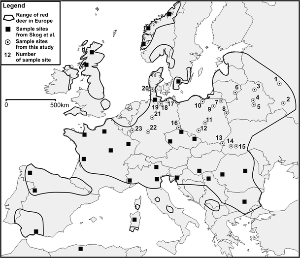 Map showing red deer distribution in Europe and sample sites of the present study and Skog et al.’s (2009). Sample sites: 1 Smolensk Region, Russia; 2 Bransk oblast, Russia; 3 Vitebsk Region, Belarus; 4 Mogilev Region, Belarus; 5 Gomel Region, Belarus; 6 Grodno Region, Belarus and Joniškis and Širvintos Districts, Lithuania; 7 Augustów, Borki and Rominta Forests, Poland; 8 Białowieża Forest (both Polish and Belarusian parts), Knyszyn and Mielnik Forests, Łomża and Sokołów Forest Districts, Poland, Brest Region, Belarus; 9 Napiwoda and Pisz Forests, Poland; 10 Bytów, Młynary, Susz, Zaporowo Forest Districts, Poland; 11 Spała and Poddębice Forest Districts, Poland; 12 Brynek, Milicz, Olesno, Prószków, Świerklaniec Forest Districts (Silesia) Poland; 13 Bieszczady Mts., Poland; 14 Tismenickii Raion, Ivano-Frankivskaya oblast, Ukraine; 15 Dolinskii Raion, Ivano-Frankivskaya oblast, Ukraine; 16 Saxony, Germany; 17 Rostock, Germany; 18 Mecklenburg, Germany; 19 Lauenburg, Germany; 20 southern Denmark; 21 Hils region, Germany; 22 Spessart and Vogelsberg, Germany; 23 Kyllwald and Gerolstein, Germany