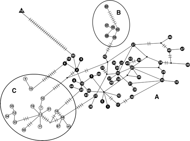 Median-joining network of the 69 red deer mtDNA control region haplotypes found in the present study. Vertical dashes along branches denote the number of mutational steps between haplotypes. Absence of dashes is equivalent to a single mutational event (irrespective of branch length). A, B and C refer to the western, North-African/Sardinian and eastern lineages, respectively