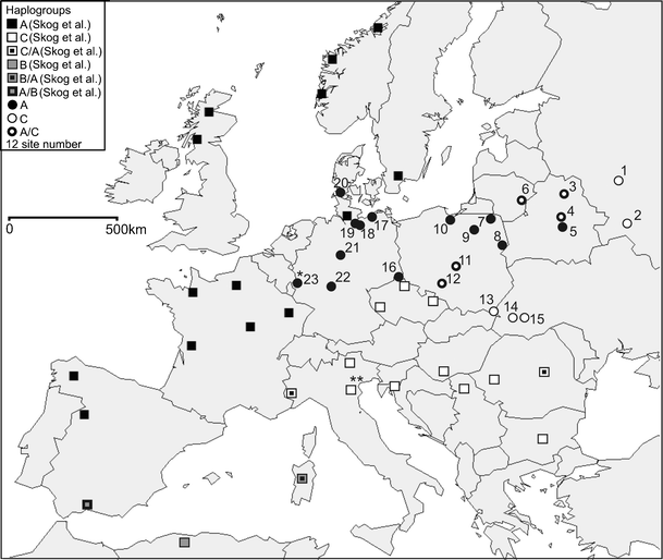 Haplotypes 16 and 41 deserve particular attention. The latter, found exclusively in Mesola in Italy, belonged to the eastern lineage C according to all approaches which is in contrast to results from Skog et al. (see “Discussion”). Haplotype 16, found in a single red deer from western Germany, was the most aberrant sequence in our data set. In the network, it forms a long branch attached to lineage A, and in the maximum parsimony tree it is the sister taxon to all other ingroup sequences, while in the NJ tree it is basal to clade B with both of them nested within lineage A. Bootstrap support, however, was below 50% in both cases.