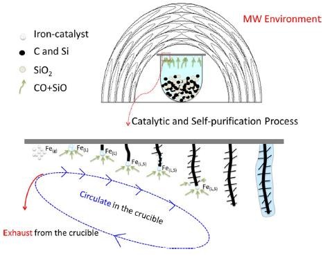 SiC/SiOx coaxial nanowires were rapidly synthesized via direct microwave irradiation in low vacuum atmosphere. During the preparation process, only graphite, silicon, silicon dioxide powders were used as raw materials and iron-containing substance was employed as catalyst. Comprehensive characterizations were employed to investigate the microstructure of the products. The results showed that a great quantity of coaxial nanowires with uniform sizes and high aspect ratio had been successfully achieved. The coaxial nanowires consist of a silicon oxide (SiOx) shell and a β-phase silicon carbide (β-SiC) core that exhibited in special tube brush like. In additional, nearly all the products were achieved in the statement of pure SiC/SiOx coaxial nanowires without the existence of metallic catalyst, indicating that the self-removal of iron (Fe) catalyst should be occurred during the synthesis process. Photoluminescence (PL) spectral analysis result indicated that such novel SiC/SiOx coaxial nanowires exhibited significant blue-shift. Besides, the measurement results of field-emission (FE) demonstrated that the SiC/SiOx coaxial nanowires had ultralow turn-on field and threshold field with values of 0.2 and 2.1 V/μm, respectively. The hetero-junction structure formed between SiOx shell and SiC core, lots of emission sites, as well as clear tips of the nanowires were applied to explain the excellent FE properties.