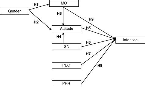 Proposed research model. MO moral obligation, SN subjective norms, PBC perceived behavior control, PPR perceived prosecution risks