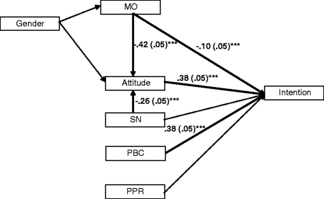 Tested model. Dotted lines indicate non-significant paths. Solid lines indicate significant paths. The numbers outside parentheses indicate standardized coefficient and those in parentheses indicate standardized error. ***p < .001; **p < .05; *p < .01. MO moral obligation, SN subjective norms, PBC perceived behavior control, PPR perceived prosecution risks