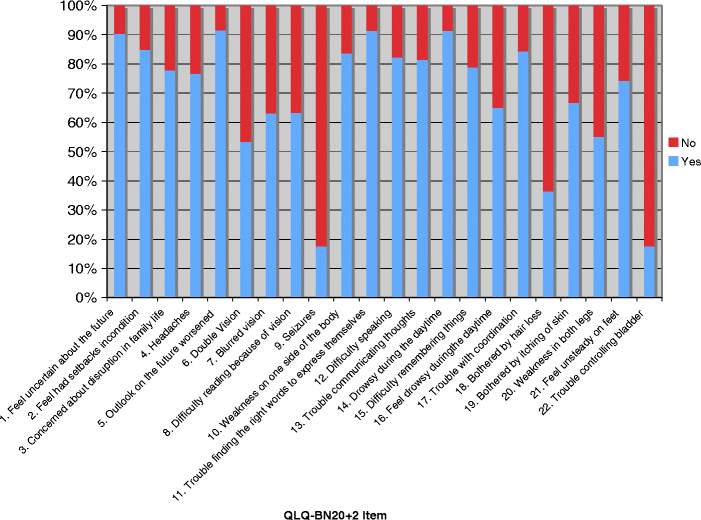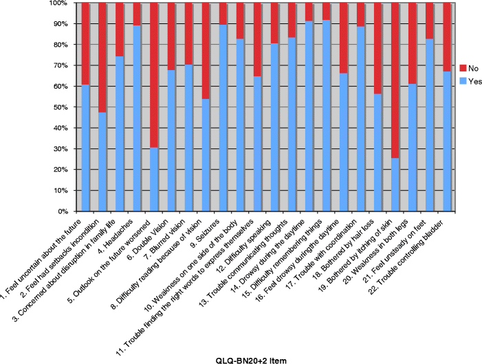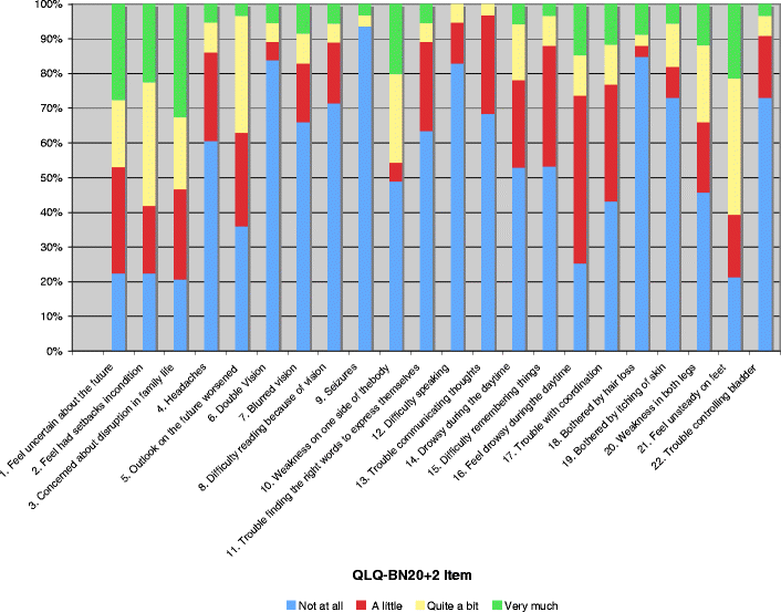 Although a small proportion of patients found each of the QLQ-BN20+2 items difficult to answer, there was no single question uniformly identified as upsetting, confusing, or annoying (Appendix I). The items presenting the most issues were: “Did you feel uncertain about the future?” (16 %); “Did you feel you had setbacks in your condition?” (12 %); and “Were you concerned about disruption of family life?” (16 %). However, nearly all stated that they would not change any of the 22 questions.