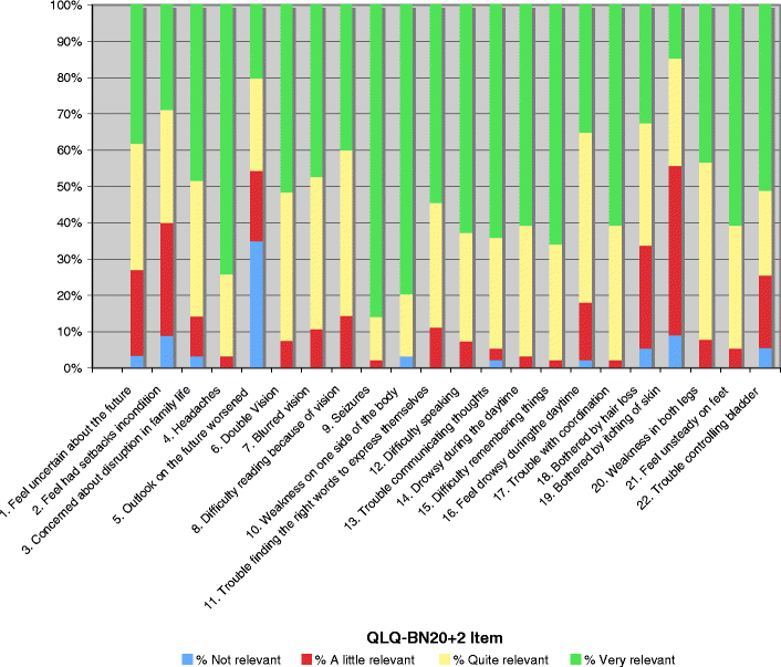 A similar procedure was followed by HCPs who were asked to indicate, for each item on the QLQ-BN20+2, its perceived relevance (1 = not at all to 4 = very much). Relevancy was defined as a combination of the frequency with which a specific complaint occurs, and the degree of difficulty it causes. HCPs were also asked to indicate whether there were irrelevant items, and any additional issues not included in either questionnaire.