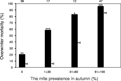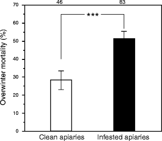 The overwinter mortality of the clean apiaries and the mite-infested apiaries. The difference in the average mortality between the clean apiaries (open bar) and the infested apiaries (black bar) was significant (***P < 0.001, ANOVA after arcsine-root transformation).
