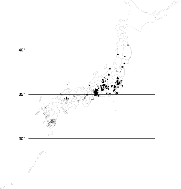 The location of apiaries used for the apiary level survey. Black circles indicate the infested apiaries where mite-infested colonies were found, and white circles represent the clean apiaries. Black triangles represent the apiaries in the infested area, and white triangles represent apiaries in clean areas where no mites were recorded in each prefecture.