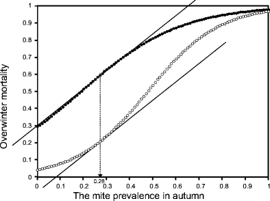 Results of logistic regression analysis of the mite prevalence and overwinter colony mortality. Black circles represent the predicted probability of mortality as calculated from the regression equation. White circles represent the predicted probability of mortality of European honeybees, ln(p/[1 − p]) = −3.094 + 6.478x (Otis and Scott-dupree 1992). (Otis and Scott-dupree [1992] reported using a value of 0.6478x in this equation, but must have intended 6.478x.) The solid lines represent the tangent slope for each species of honeybee at 0.28 mite prevalence where the slopes are equal.
