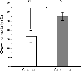 The overwinter mortality of the un-investigated apiaries in the clean area and in the infested area. The difference in the average apiary mortality between the clean area (open bar) and the infested area (gray bar) was significant (*P < 0.05, ANOVA after arcsine-root transformation).
