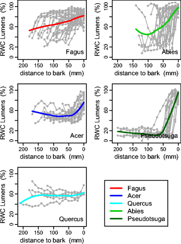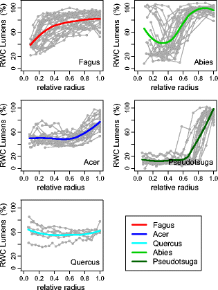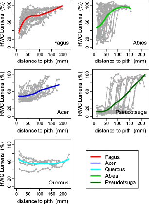 Basic density Relative water content Degree of lumen saturation Sapwood Radial and vertical variationsNotes