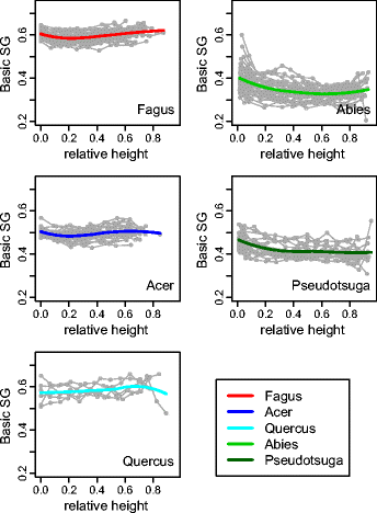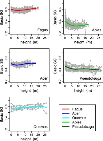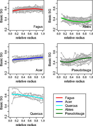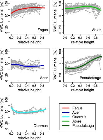 The radial and vertical variations of basic specific gravity (BSG) and relative water content of lumens (RWC L ) were studied for five species: Quercus petraea/robur, Fagus sylvatica, Acer pseudoplatanus, Abies alba and Pseudotsuga menziesii. The observations were compared with typical patterns of variations reported in the literature.