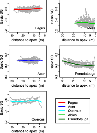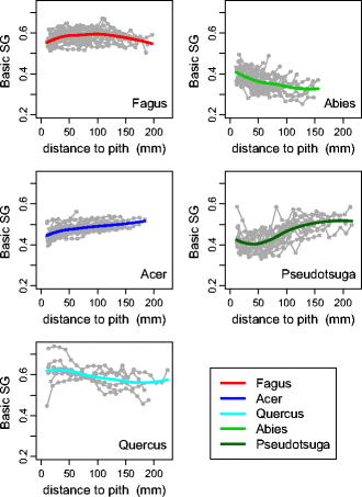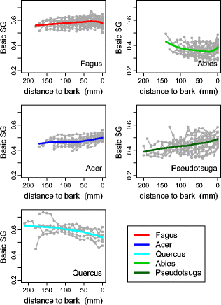 At breast height, BSG was found to clearly increase radially (pith to bark) for two species and to decrease for one species. For F. sylvatica and A. alba, the radial variations of BSG were rather U-shaped, with in particular inner wood areas showing respectively lower and higher BSG than the corresponding mature wood. RWC L increased generally from inner to outer area but wet sapwood was clearly distinguishable only for the coniferous species. Vertical variations of BSG and RWC L were strongly dependant on the species with usually non-linear patterns.
