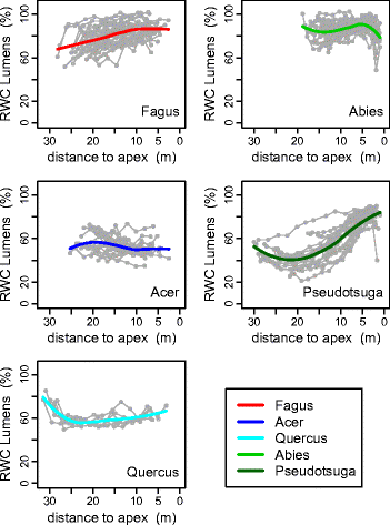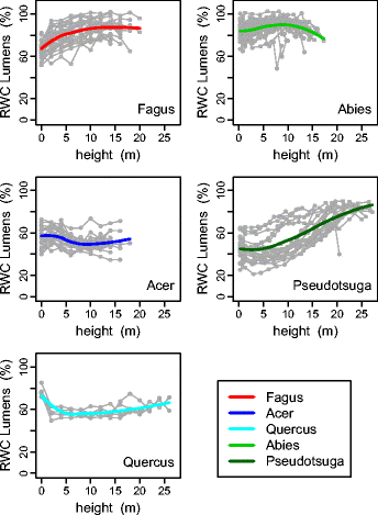 Intensive measurements of basic specific gravity and relative water content of lumens show that within-stem variations strongly depend on species and cannot be summarised through the typical patterns reported in the literature; breast height measurements are not always representative of the whole stem.