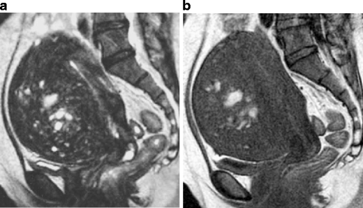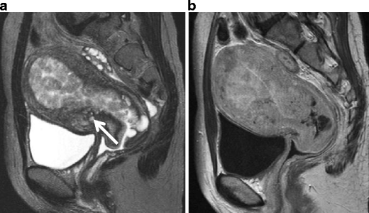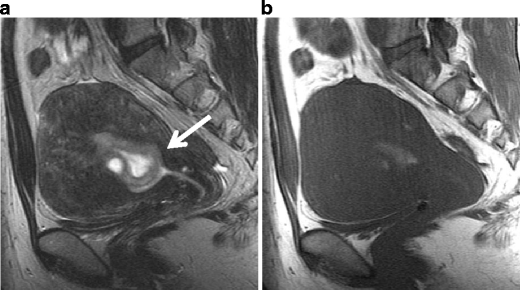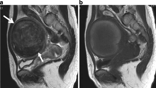 Red degeneration in a 36-year-old woman. a Sagittal T2-weighted image demonstrates a well-defined myometrial mass of low intensity, associated with thick rim of distinct low signal intensity (arrows). b T1-weighted image reveals entirely increased intensity in the tumor, suggesting red degeneration
