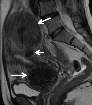 Leiomyoma in a 42-year-old woman. Sagittal T2-weighted image demonstrates well-demarcated masses of distinct low intensity in the myometrium (arrows)