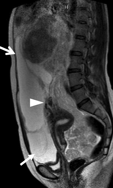 A huge subserosal leiomyoma in a 40-year-old woman. a Sagittal T2-weighted image demonstrates a huge heterogenous tumor consisting of cystic components of bright intensity anteriorly (arrows) and solid component of intermediate to low intensity. Note the tumor vessels extending from the myometrium to the tumor (arrowhead)