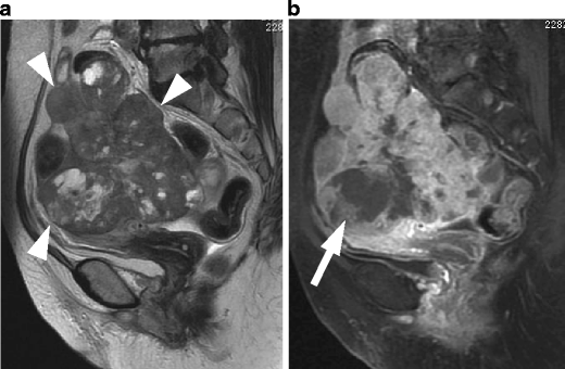 Leiomyosarcoma in a 60-year-old woman. a Sagittal T2-weighted image demonstrates an irregular-shaped large mass of heterogeneous intensity in the posterior wall of the uterus (arrows). b Postcontrast T1-weighted images with fat suppression demonstrate multifocal, unenhanced areas of necrosis within the tumor