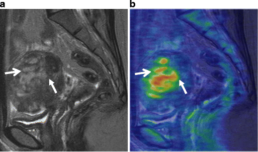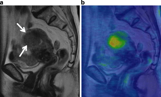 Endometrioid carcinoma in 69-year-old woman. a T2-weighted image demonstrates an ill-defined myometrial mass of decreased intensity (arrows). b Fusion image with DWI onto T2-weighted image shows increased intensity in the myometrial mass, which represents endometrioid carcinoma infiltrating into the myometrium