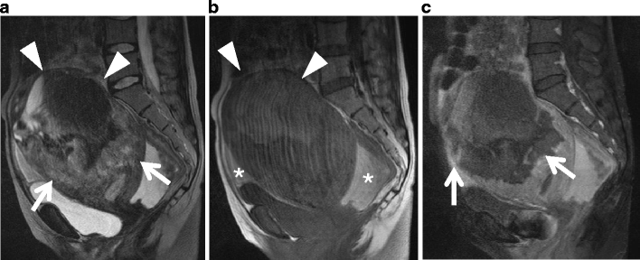 Undifferentiated stromal sarcoma in a 22-year-old female who presented with acute abdomen due to uterine rupture. a Sagittal T2-weighted image demonstrates an ill-defined myometrial mass of heterogeneous appearance in the anterior wall (arrows). The upper portion of the tumor containing fluid-fluid level represents hemorrhagic necrosis within the tumor (arrowheads). b T1-weighted image demonstrates increased signal intensity corresponding to the area of hemorrhagic necrosis (arrowheads). Hemorrhagic ascites of increased signal intensity also is present in the Douglas fossa and uterovesical fossa (asterisks). c Postcontrast T1-weighted image with fat suppression demonstrates heterogeneous enhancement within the solid component of the tumor (arrows)