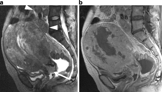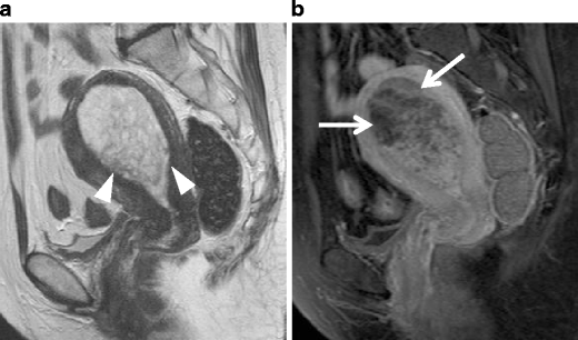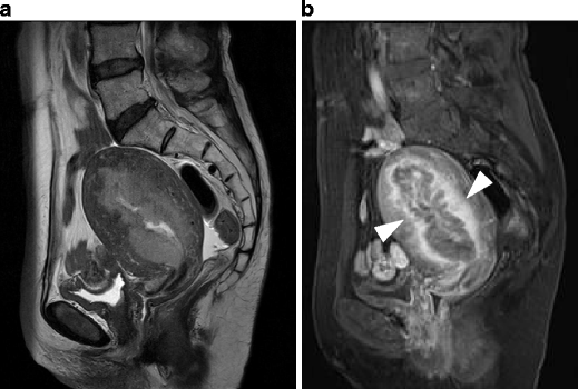 Adenosarcoma in a 27-year-old woman. a Sagittal T2-weighted image shows adenosarcoma composed of numerous polypoid mass, which protrude into the endometrial cavity. Multiple punctate foci of high intensity within the tumor represent microscopically dilated glands in the tumor. The disruption of the endometrial-myometrial border and heterogeneously increased intensity in the anterior wall represents invasion of the tumor into the myometrium (arrows). b Postcontrast T1-weighted image shows good enhancement in the tumor