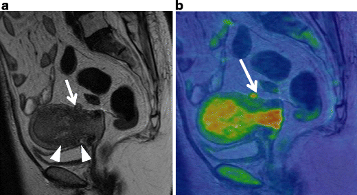 Serous carcinoma in a 55-year-old female. a Sagittal T2-weighted image demonstrates an endometrial tumor of decreased intensity occupying the endometrial cavity, and protruding into the external cervical os. Note the endometrial-myometrial border in both the corpus and cervix is diffusely obscured, suggesting myometrial invasion of the tumor (arrowheads). There is a small implant on the posterior serosal surface of the uterus (arrow). b Fusion image of DWI onto T2-weighted image exhibits increased intensity corresponding to the tumor in the endometrial cavity. The implantation on the posterior wall is also clearly demonstrated with excellent tissue contrast (arrowhead)