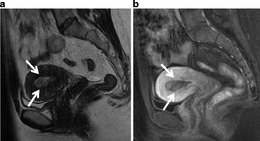 Adenomyoma in a 40-year-old woman. a Sagittal T2-weighted image demonstrates a polypoid mass of decreased intensity in the endometrium (arrows), containing cystic space of bright intensity. The myometrium in the anterior wall and fundus is diffusely thickened by simultaneous adenomyosis. b T1-weighted image shows high intensity corresponding to the cystic space, suggesting the hemorrhagic fluid within the mass