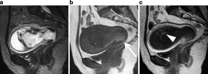 Carcinosarcoma in a 66-year-old female. a T2-weighted image demonstrates a large polypoid tumor (arrowheads) of heterogeneously high intensity, containing fresh hemorrhage of distinct low intensity. The tumor protrudes into the cervical canal. Fluid-fluid level in the uterine cavity represents hematometra. b T1-weighted image shows area of high intensity (arrow) in the tumor, suggesting intratumoral hemorrhage. c Postcontrast T1-weighted image shows fine reticular enhancement in the lesion (arrowheads)