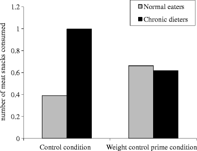 A recent field study has provided a first test of this hypothesis. In a real-life setting, participants were exposed to food temptations and also primed with the goal of weight control, while their eating behavior was observed [18•]. The study was conducted in a local butcher’s shop, in which the smell of grilled chicken emanated from a large grill oven while customers were being served. At the same time, customers could freely sample from bite-size meat snacks on a tray placed on the counter. In the diet prime condition, a poster announced the availability of a low-calorie recipe available in the store. In the control condition, this diet poster was not present. As the dependent variable, the number of meat snacks eaten by participants was assessed unobtrusively, and to determine whether they were chronic dieters or normal eaters, they later filled in a brief questionnaire with questions on their dieting motivation.