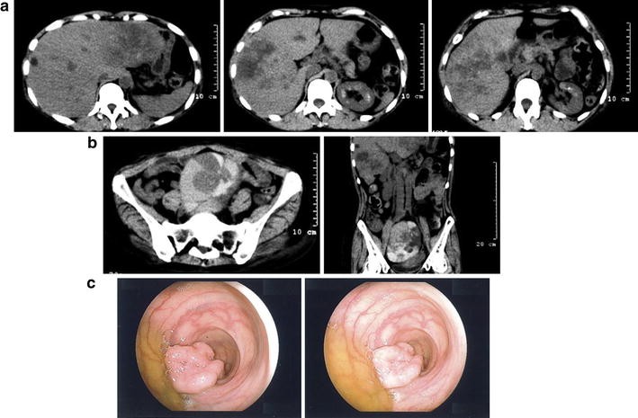 CT images and colonoscopy findings at onset. a Axial images of the liver. Multiple low-density areas suggest metastases. b Axial and coronal images of the pelvic tumor. Various densities ranging from low to high, suggesting various liquid and solid components, are seen. c Captured images during colonoscopy. A massive type 2 tumor is seen in the sigmoid colon