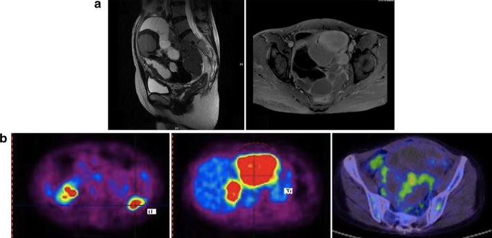 PET–CT and MRI images 1 month after onset. a MRI images of the pelvic tumor. Mixtures of diverse intensities ranging from low to high, suggesting a variety of liquid and solid components, are seen. There seems to be a hemorrhage and mucus in it. Strong enhancement is seen in the cyst wall. A multilocular cystic ovary including a metastatic lesion of cyst walls with contrast enhancement was possibly suggested. b Axial PET–CT fusion images of the colon, liver, and ovary. SUVmax values of 9.0 in the colon, 7–10.0 in the liver, and 4.0 in the ovary were detected