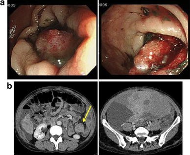 Colonoscopy and CT images 2 months after onset. a Captured images during colonoscopy. Compared with Fig. 1c, the tumor had grown so rapidly that the lumen was subtotally occluded. b CT images of the colon and pelvic tumors. Left panel Upper colon from the stenosis site at the sigmoid with a massive tumor is enlarged. Arrow indicates the lesion. Right panel Pelvic tumor is also extremely increased in size compared with that in the former images