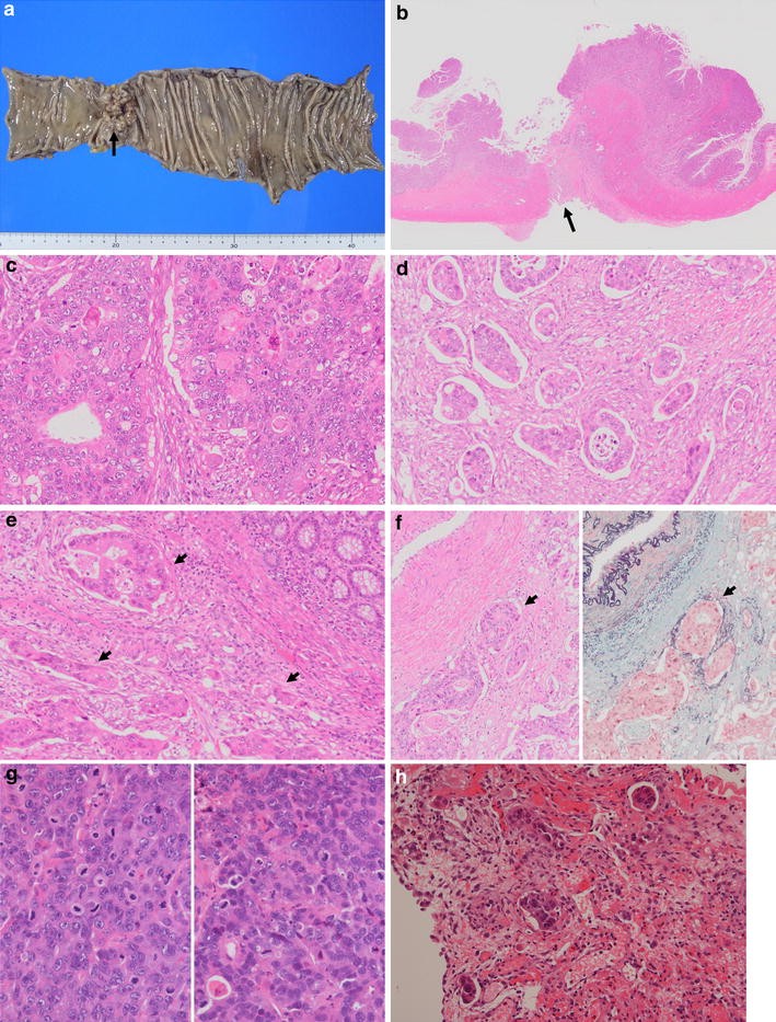 Pathological findings of the descending colon cancer. a Macroscopic view of the resected descending colon with the cancer. A circumferential type 2 tumor (30 × 25 mm) is seen. b Loupe view. Arrow indicates the part where cancer cells penetrated the serosa. c Detailed microscopic view. Moderately differentiated tubular adenocarcinoma (tub2) with a cribriform pattern is apparent. There is not much difference compared with conventional colorectal cancer. d An invasive micropapillary carcinoma pattern (IMPC). Nesting cancer cells within spaces separating themselves from the surrounding stroma is seen in the invasive area. e Lymphatic involvement. Arrows indicate the parts. f Venous involvement. Left panel H&E stain. Arrow indicates the parts. Right panel Elastica-Masson stain for veins. Arrow indicates the same parts of the left panel. Liver (g) and peritoneal (h) metastases. The histologically similar, moderately differentiated, tubular adenocarcinomas originated from primary colon cancer are seen