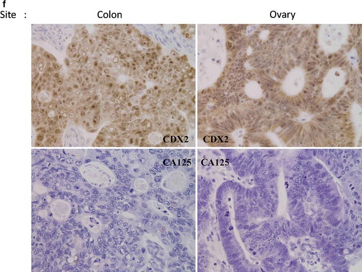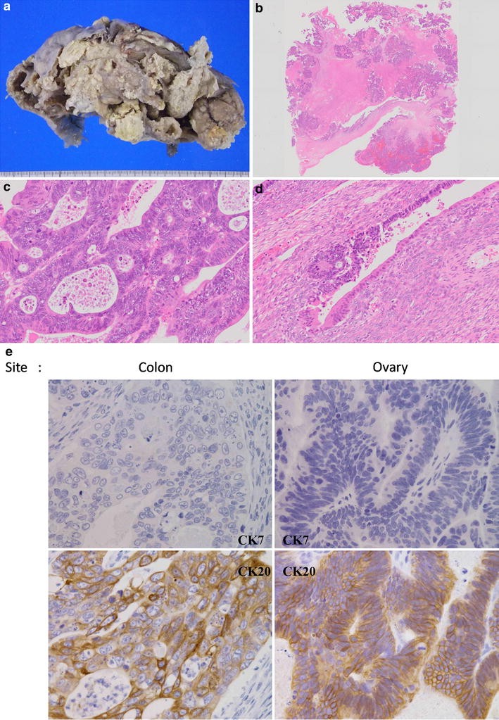 Pathological findings of the right ovarian cancer. a Macroscopic view of the resected right ovary with the cancer. It is 180 × 150 mm in size and consisted of cystic and solid parts. b Loupe view. Papillary or solid growths of the tumor besides wide necrotic lesions are seen in the cyst. c Detailed microscopic view. Some columnar atypical cells with tubular formation similar to that of colon cancer were seen. d In situ lesion. There are epithelial cells overlaying the inner surface of the cyst, which shows definitive transitional lesions from benign epithelium to an atypical one. The in situ lesion is evidence of primary ovarian cancer. e IHC studies for CK7 (left upper and right upper panels) and CK20 (left lower and right lower panels). Left upper and left lower panels Colon cancer. Right upper and right lower panels Ovarian cancer. f IHC studies for CDX2 (left upper and right upper panels) and CA125 (left lower and right lower panels). Left upper and left lower panels Colon cancer. Right upper and right lower panels Ovarian cancer