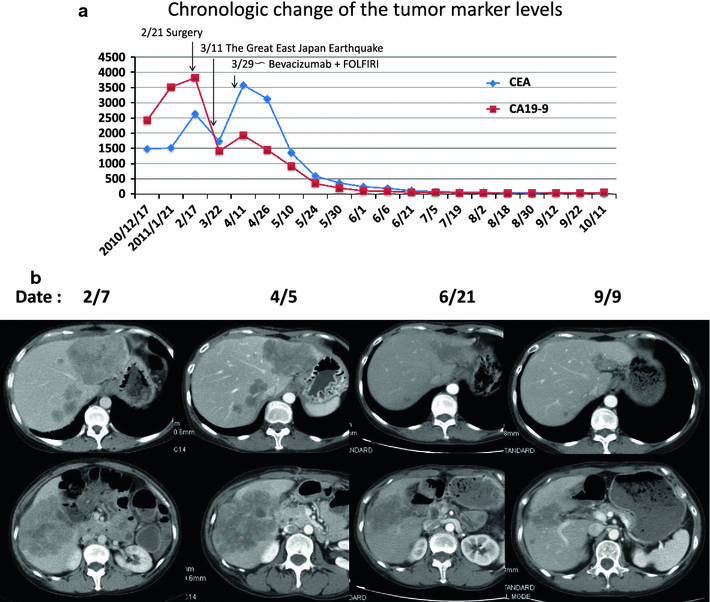 Therapeutic effect of the systemic bevacizumab + FOLFIRI therapy. a Chronological change in the tumor marker levels. They decreased dramatically after administration of the systemic bevacizumab + FOLFIRI therapy. b Chronological change in liver metastases. They have decreased dramatically after administration of systemic bevacizumab + FOLFIRI therapy and have been in the PR state over a year